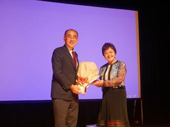 実は、その日の講演会では一つの企みがありまして、小﨑先生には秘密で、講演会の後に美しい女性から花束を贈呈してビックリしてもらおうと思っていたのです。